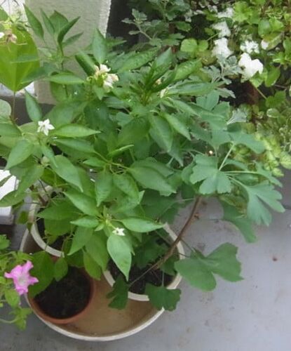 9/27 旅行に行く朝の、ベランダの様子です。 受け皿に 水を張ったのは、 イチョウ、トウガラシとハイビスカス。 モミジ 全部の鉢に たっぷり水やりします。 花盛りの寄せ植え鉢は どうなるかしら? 挿し木から育てたアベリアの花。 ベランダの外寄りに並べて…